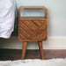 • Mini Lille Curved Nightstand - Add this unique solid wood Mini Lille Curved Bedside to your bedroom, constructed from 100% solid mango wood in an oak-ish finish, this piece features a unique line hand-carved design on the drawer fronts as well as an open space for convenience and 4 Nordic style legs which compliment the body nicely and give the entire piece a contemporary look. The perfect addition to the home.