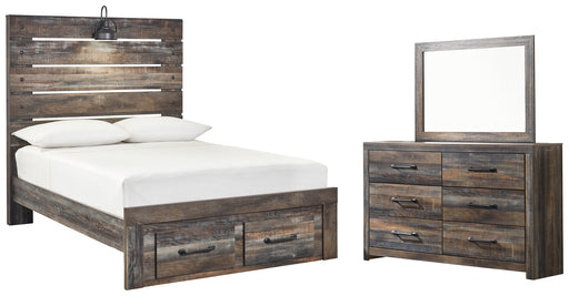 Drystan Queen Panel Bed with 2 Storage Drawers with Mirrored Dresser