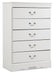 Details Made of engineered wood (MDF/particleboard), 5 smooth-gliding drawers, Aged pewter-tone hardware, Small Space Solution, Includes tipover restraint device, Safety is a top priority, clothing storage units are designed to meet the most current standard for stability, ASTM F 2057 (ASTM International), Drawers extend out to accommodate maximum access to drawer interior while maintaining safety