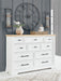 Casual style with substance. This two-tone dresser raises the bar on comfortably cozy design in your soothing sanctuary. A sturdy silhouette with a classic white finish and black metal hardware exudes modern farmhouse vibes. The butcher block oak veneer top adds a relaxed aesthetic. And this charmingly curated piece is spacious enough for all your essentials.