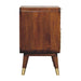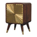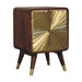 - Avora Brass Embossed 2 Drawer Chestnut Nightstand - An exquisite blend of elegance and artistry, this nightstand is handcrafted from 100% Solid Mango Wood in a rich chestnut finish, beautifully complemented by a striking brass embossing on the front. The intricate sunburst pattern on the cabinet doors, with metallic handles, adds a touch of glamour, while the Nordic-style legs with brass caps enhance its refined aesthetic. Designed with both style and functionality in mind, this piece offers discreet storage for your essentials while serving as a stunning focal point in any bedroom or living space. A true statement of craftsmanship, it seamlessly combines luxury with sustainable design.