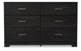 With its clean-lined look and modern attitude, this dresser is a fresh style awakening. A warm charcoal hue over replicated oak grain easily complements other furniture finishes. Smooth drawer fronts with antiqued pewter-tone handles complete the aesthetic.