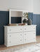 Details B139B47: Includes panel headboard/footboard and rails, Made with engineered wood (MDF/particleboard/plywood) and decorative laminate for the right balance of affordability and durability, Replicated solid white paint, Decorative laminate replicates natural or man-made material surfaces with consistent color, pattern and texture, Foundation/box spring required, sold separately, Mattress available, sold separately, Assembly required, B139B40: Includes dresser and mirror, Made of engineered wood (MDF/particleboard), Knobs with pewter-tone finish, Scalloped moulding, 6 smooth-operating drawers, Includes tipover restraint device, Mirror attaches to back of dresser; can also be mounted on wall horizontally or vertically, Safety is a top priority, clothing storage units are designed to meet the most current standard for stability, ASTM F 2057 (ASTM International), Drawers extend out to accommodate maximum access to drawer interior while maintaining safety, B139-91: Made of engineered wood (MDF/particleboard), Pewter-tone knobs, 1 smooth-operating drawer, 1 storage cubby, Scalloped moulding, Small Space Solution,