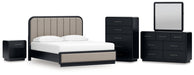 Rowanbeck California King Upholstered Panel Bed with Mirrored Dresser, Chest and Nightstand