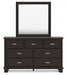 | Details | Includes dresser and mirror, Made with hardwood solids, engineered wood veneer and MDF substrates, Dark brown finish, Metal bar pulls with bright nickel-tone finish, 7 smooth-gliding drawers with dovetail construction and metal center guides, Drawer interiors are lined with a wood grain laminate for a clean, finished look, Top moulding on dresser, Mirror attaches to back of dresser | |