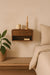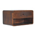 - Curve Upper Slot Floating Bedside - The bigger brother to our original Floating Curve Open Slot Bedside, this minimalistic wall-mounted unit has been constructed from 100% solid mango wood in a finish and features 1 drawer with a shiny knob along with 1 open shelf for storing any bits and pieces you wish to keep close by before bedtime. It's neat and clean design can easily be mounted on the wall without the fuss of any legs. Caution! Do not sit on the unit.