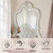 - Elegant Design: The Edalene Pearl White Finish Mirror features a graceful arched silhouette with intricate scrolled trim and a rose crown decor, adding timeless sophistication to any room.