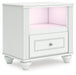 Details PCB1819B9: Includes upholstered panel headboard, panel footboard, roll slats and side storage with rails, Made with engineered wood (MDF/particleboard/plywood) and decorative laminate for the right balance of affordability and durability , Matte white finish, Decorative laminate replicates natural or man-made material surfaces with consistent color, pattern and texture , Polyester upholstery, Crystal drawer knobs; acrylic ball tops, 2 smooth-gliding drawers; drawer interiors are lined with a faux linen laminate for a clean, finished look, Open cubbies accommodate any 10.5" W x 10.5" D x 11" H storage bin (not included), Pink, purple and white LED lighting options; touch button control, Power cord included; UL Listed, Bed does not require additional foundation/box spring; accommodates most zero clearance adjustable bases with the addition of a bunkie board, Mattress available, sold separately, Minor assembly required, PCB1819B2: Includes dresser and mirror, Made with engineered wood (MDF/particleboard/plywood) and decorative laminate for the right balance of affordability and durability , Matte white finish, Decorative laminate replicates natural or man-made material surfaces with consistent color, pattern and texture , Crystal drawer knobs, 6 smooth-gliding drawers, Drawer interiors are lined with a faux linen laminate for a clean, finished look, Safety is a top priority, clothing storage units are designed to meet the most current standards for stability, ATM F 2057 (ASTM International), Drawers extend out to accommodate maximum access to drawer interior while maintaining safety, Mirror can be mounted on wall vertically , Minor assembly required, PCB1819-91: Made with engineered wood (MDF/particleboard/plywood) and decorative laminate for the right balance of affordability and durability, Matte white finish, Decorative laminate replicates natural or man-made material surfaces with consistent color, pattern and texture, Crystal drawer knob, 1 smooth-operating drawer, Drawer interior is lined with a faux linen laminate for a clean, finished look, Open shelf, USB-A and USB-C charging ports, Pink, purple and white LED lighting options; touch button control, Power cord included; UL Listed, Minor assembly required,