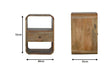 - Features: solid mango wood,oak-ish finish,round edges,1 drawer,brass knob,open slot