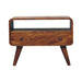 - Mini Chestnut Curved Media Unit - The mini version of our famous IN309, this solid timber media unit is expertly constructed from 100% solid mango wood in a lovely chestnut finish. This modern design offers clean, curved edges and features 1 drawer which has a shiny knob, an open slot to place any books, photo frames, ornaments, and 4 Nordic style legs. This petite product is a part of Recession Collection.