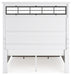 Details B844B2: Includes panel headboard, storage footboard, rails and roll slats, Footboard made with hardwood solids, MDF substrates and butcher block oak veneer, Headboard and rails made with hardwood solids and MDF substrates, White finish, Headboard with inset black metal barn sash, 2 drawers in footboard with fully finished interior, dovetail construction and ball-bearing side glides, Pulls with matte black finish, Bed does not require a foundation/box spring, Mattress available, sold separately, Assembly required, B844B1: Includes dresser and mirror, Made with hardwood solids, MDF substrates and butcher block oak veneer, Dresser with 2-tone finish (white finish; butcher block oak veneer with natural finish), Pulls with matte black finish, 10 spacious drawers with fully finished interiors (top drawers felt lined), dovetail construction and ball-bearing side glides , Drawers with inset picture fronts, Mirror attaches to back of dresser,