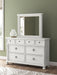 | Details | PCB823B2: Includes headboard/footboard panels, posts and poster rails , Made with hardwood solids, veneers and MDF substrates , Side rails feature laminated solid hardwood slat support rails (or LVL) with glued and screwed blocking for added strength, Rubbed antiqued white finish , Foundation/box spring required, sold separately, Mattress available, sold separately , Assembly required, PCB823B1: Includes dresser and mirror, Dresser made with hardwood solids, veneers and MDF substrates , Mirror made with solid wood, Rubbed antiqued white finish, Metal hardware with pewter-tone finish, 8 smooth-gliding drawers with fully finished interiors, French/English dovetail construction and heavy-duty ball-bearing side glides, Top drawers felt lined, Mirror attaches to back of dresser, | |