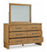 Details Includes dresser and mirror, Made with hardwood solids, mango wood veneer and MDF substrate, Light wood-tone finish, 6 smooth-gliding drawers with fully finished interior, dovetail construction and heavy duty ball-bearing side glides (top drawers felt lined) , Metal drawer pulls with darkened bronze-tone finish, Mirror attaches to back of dresser
