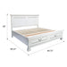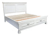 • The Stoney Creek king storage bed offers large-scale designs combined with a textured, antiqued white finish. Giving additional charm, the antiqued, blackened metal hardware and tapered leg details complete this relaxing retreat.