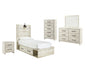 Details B192-46: Made of engineered wood (MDF/particleboard) and decorative laminate, Wispy white finish over replicated oak grain with authentic touch, Large-scale hardware with dark finish, 5 smooth-gliding drawers, Drawer interiors are lined with a faux linen laminate for a clean, finished look, Safety is a top priority, clothing storage units are designed to meet the most current standard for stability, ASTM F 2057 (ASTM International), Drawers extend out to accommodate maximum access to drawer interior while maintaining safety, B192-92: Made of engineered wood (MDF/particleboard) and decorative laminate, Wispy white finish over replicated oak grain with authentic touch, Large-scale hardware with dark finish, 2 smooth-gliding drawers, Drawers lined with faux linen laminate for finished aesthetic, 2 slim-profile USB charging stations, Power cord included; UL Listed, B192B1: Includes dresser with mirror, Made of engineered wood (MDF/particleboard) and decorative laminate, Wispy white finish over replicated oak grain with authentic touch, 6 smooth-gliding drawers, Drawer interiors are lined with a faux linen laminate for a clean, finished look, Large-scale hardware with dark finish, Mirror attaches to back of dresser, Assembly required, B192B21: Includes headboard, footboard, side storage, rails and slats, Made of engineered wood (MDF/particleboard) and decorative laminate, Wispy white finish over replicated oak grain with authentic touch, Large-scale hardware with dark finish, Decorative sconce light, LED with 3 AA batteries, 4 smooth-gliding storage drawers, 4 storage cubbies, 2 slim-profile USB charging ports, Power cord included; UL-listed, Bed does not require additional foundation/box spring; accommodates most zero clearance adjustable bases with the addition of a bunkie board, Mattress available, sold separately, Assembly required,