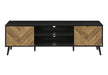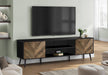 - Stylish Storage: The media entertainment center is adorned with brown wood-look doors featuring slanted groove lines, enhancing its stylish appeal, and includes two wire management holes for organized storage.