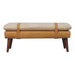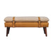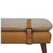 - Artisan Furniture Solid Wood Boucle Tan Leather Bench - Derived from the French word for a curled or ringed yarn or fabric. This handwoven upholstered furniture piece is made of 100% cotton and natural yarn, combining buffalo hide leather to create a beautiful fusion of colours and materials. It has a belted strap design and also features solid wood legs which have an oak-ish finish providing strength and durability.