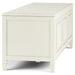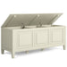 - Features a lift-up lid with child safety hinges that opens to reveal three large storage compartments