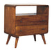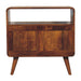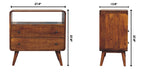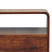 - Console Curved Nordic Charm Artisan Furniture - This sleek console table is crafted from 100% Solid Mango Wood and finished in a warm Chestnut tone, showcasing its natural grain patterns. The design features two compact drawers with subtle brass black knobs, offering convenient storage, while the open shelf provides space for decor or essentials. The curved edges and Nordic-style legs lend a mid-century modern aesthetic, making it a stylish addition to living rooms, hallways, or bedrooms. Combining functionality with elegance, this piece elevates any space with its timeless design.