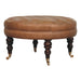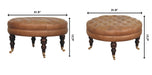 - Brown Buffalo Leather Round Ottoman with Castor Legs - Bringing a touch of heritage charm to your home, this round ottoman is upholstered in 100% Buffalo hide leather with a luxurious hand-tufted design. The deep button detailing adds timeless elegance, while the handcrafted turned legs made from 100% Solid Mango Wood in rich walnut finish enhance its classic appeal. Fitted with brass castor wheels, it offers effortless mobility, making it a versatile addition to living rooms, bedrooms, or entryways. Whether used as a footrest, accent piece, or extra seating, this ottoman combines sophisticated craftsmanship with practical functionality for a refined and inviting space.