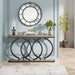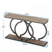 - Elegant Industrial Design: Features a vintage grey wood top with natural texture and a striking geometric metal frame with symmetrical O-shaped loops.