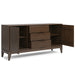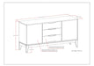 - Features three (3 )central drawers with metal glides, and two (2) sidedoors that open to large storage spaces with one (1) adjustable shelf each.