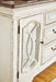 | Details | Made of veneers, wood and engineered wood, Antiqued two-tone finish, 3 smooth-gliding drawers with dovetail construction and felt bottoms, Bail pulls and knobs in dark bronze tone finish, Pair of cabinet doors with inset mirrored glass and decorative fretwork, 2 adjustable shelves, Assembly required | |
