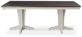 Details Made with solid acacia wood, cherry veneer and MDF substrates, Glazed light gray painted finish with brown cherry-stained top, Tabletop with planked wood effect, Double pedestal base, Assembly required
