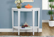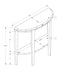 - Design and Structure: This console table features a half-moon shape with a 2-tier design, including a fixed bottom shelf for additional storage. It boasts a thick-panel construction in a wood-look finish, complete with a beveled tabletop, table apron, and robust, tapered legs.