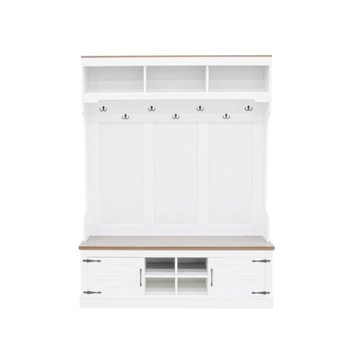 Hearth and HavenAll-in-One Entryway Organizer:Combines a comfortable seating bench, coat rack, shoe storage, and open shelving in one space-efficient unitperfect ...