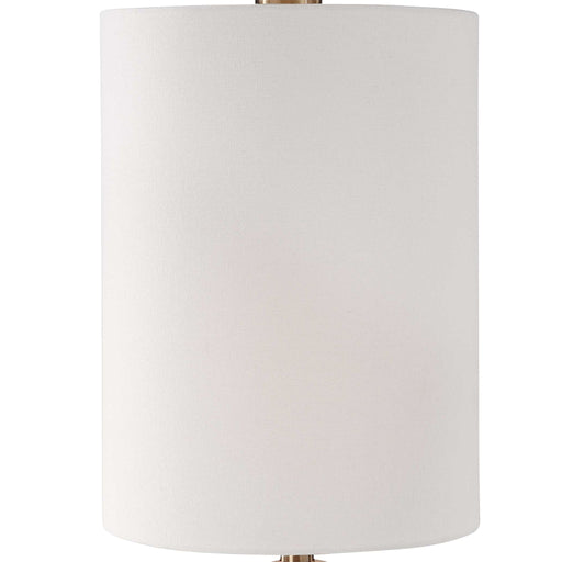 UttermostThis Sophisticated Table Lamp Showcases A Streamlined Metal Column Base Finished In Antique Brass. The Round Hardback Shade Is Covered In White Lin...