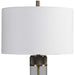 Showcasing A Clean Transitional Look, This Table Lamp Features A Clear Glass Base Accented With Antiqued Brass Plated, Heavy Textured Iron Details For A Soft Industrial Feel. The Lamp Is Paired With A White Fabric Drum Shade.
