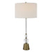 This Elegant Table Lamp Features A Tapered Crystal Column, Paired With Thick Crystal Spheres, Creating A Timeless Design That's Accented With Antiqued Brass Plated Details For An Updated Appeal. The Round Drum Shade Is Covered In A Crisp White Linen Fabric.