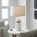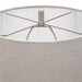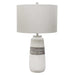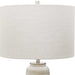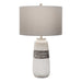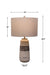 Showcasing A Rustic Casual Look, This Ceramic Table Lamp Features An Off-white Crackle Glaze With Distressed Rust Brown Details And Noticeable Ribbed Texture, Paired With Plated Brushed Nickel Accents. A Light Gray Linen Fabric Drum Shade Complements The Piece.