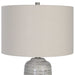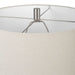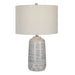 This Ceramic Table Lamp Has A Unique Shape Featuring A Traditional Style Urn Body That Has Cut Edges At The Bottom For A Subtle Contemporary Flair, Finished In An Ivory Glaze With A Heavy Striped Gray Drip And Brushed Nickel Plated Accents. The Lamp Is Complemented By A Hardback Drum Shade In A Light Beige Linen Fabric With Natural Slubbing.