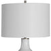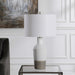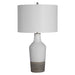 This Ceramic Lamp Features A White Crackle Glaze Finish Paired With A Ribbed Textured Bottom Half Finished In An Aged Terracotta Tone, Accented By Light Antique Brushed Brass Details. A Simple White Linen Fabric Drum Shade Complements The Piece.
