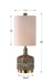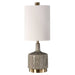 Finished In A Crackled Gray Glaze, This Ceramic Table Lamp Echoes Mid-century And Contemporary Styles. The Base Of This Piece Showcases An Embossed Repeating Geometric Design, Accented With Antique Brass Plated Details. The Round Hardback Shade Is A White Linen Fabric With Natural Slubbing.