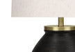 - Stylish Design: 25" contemporary table lamp with an elegant jar-shaped black concrete base featuring fine lined ridges, topped with an ivory linen drum shade and round gold finial.