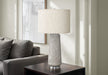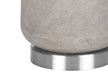 - Modern Design: Features a subtly textured grey resin cylinder base with polished silver metal footing and an ivory linen drum shade topped with a silver finial.