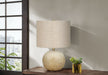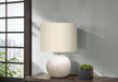 - Chic Design: Sphere-shaped table lamp with a concrete base and textured finish, paired with an linen drum shade and gold finial for a contemporary look.