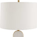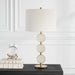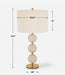 This Table Lamp Brings A Soft Contemporary Flair To Any Room By Featuring Three Suspended Alabaster Disk Surrounded By A Sleek Metal Base Finished In A Plated Brushed Brass. The Round Hardback Shade Is Covered In A Crisp White Linen Fabric.