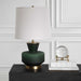 Inspired By Mid-Century Modern Design, This Table Lamp Features A Unique Dark Emerald Green Glass Base That's Accented With Lightly Antiqued Brass Plated Details. The Tapered Round Hardback Shade Is Covered In A Crisp White Linen Fabric.