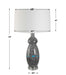 This Curvy Glass Base Features A Soft Gray Background With Mottled Black Details Displayed On A Thick Crystal Foot With Plated Brushed Nickel Accents. The Slightly Tapered Drum Shade Is Covered In A Crisp White Linen Fabric. Due To The Nature Of Fired Glazes On Ceramic Lamps, Finishes Will Vary Slightly.
