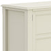 - Transitional design includes rounded molded table top, ladder framed doors, square, slightly tapered legs and antique bronze classic drawer pulls