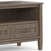 - Features three spacious bottom drawers with metal glides and two large centrally located open shelves