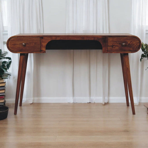 Artisan FurnitureCurved Chestnut Writing Desk - Introducing our stylish Writing Desk, crafted from solid mango wood. It's sustainably sourced and comes in a beauti...
