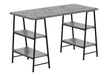 - Ample Storage: Equipped with four fixed, open shelves, this desk provides ample storage options for small workspaces. The shelves come in two different sizes, finished with a smooth laminate.