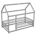 Full Size Floor Wooden Bed With House Roof Frame, Fence Guardrails - Gray