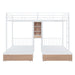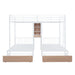 This triple bunk bed is a space-saving solution for multi-child families, featuring a bed over two beds. Its vertical design maximizes space, making it ideal for large families and sleepovers. The with accents adds a modern touch. Built for durability, it includes a desk and three-layer shelves for study and storage, plus two large drawers under the lower beds. This versatile set can be used as a stacked unit or separated into three individual beds to suit your needs.