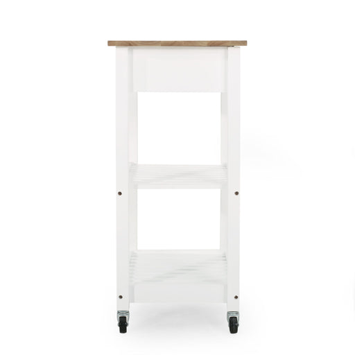 AcmeVersatile Storage Options: This kitchen cart features a wooden top, two doors with shelves inside, open storage with three compartments, and ...